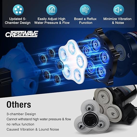 CrestWave Fresh Water Pump 7GPM 70PSI, 110V AC, Upgraded Five Chamber Self-Priming Diaphragm Water Pump with Pressure Switch and Strainer for RV, Home Water System, Irrigating & Industrial Settings